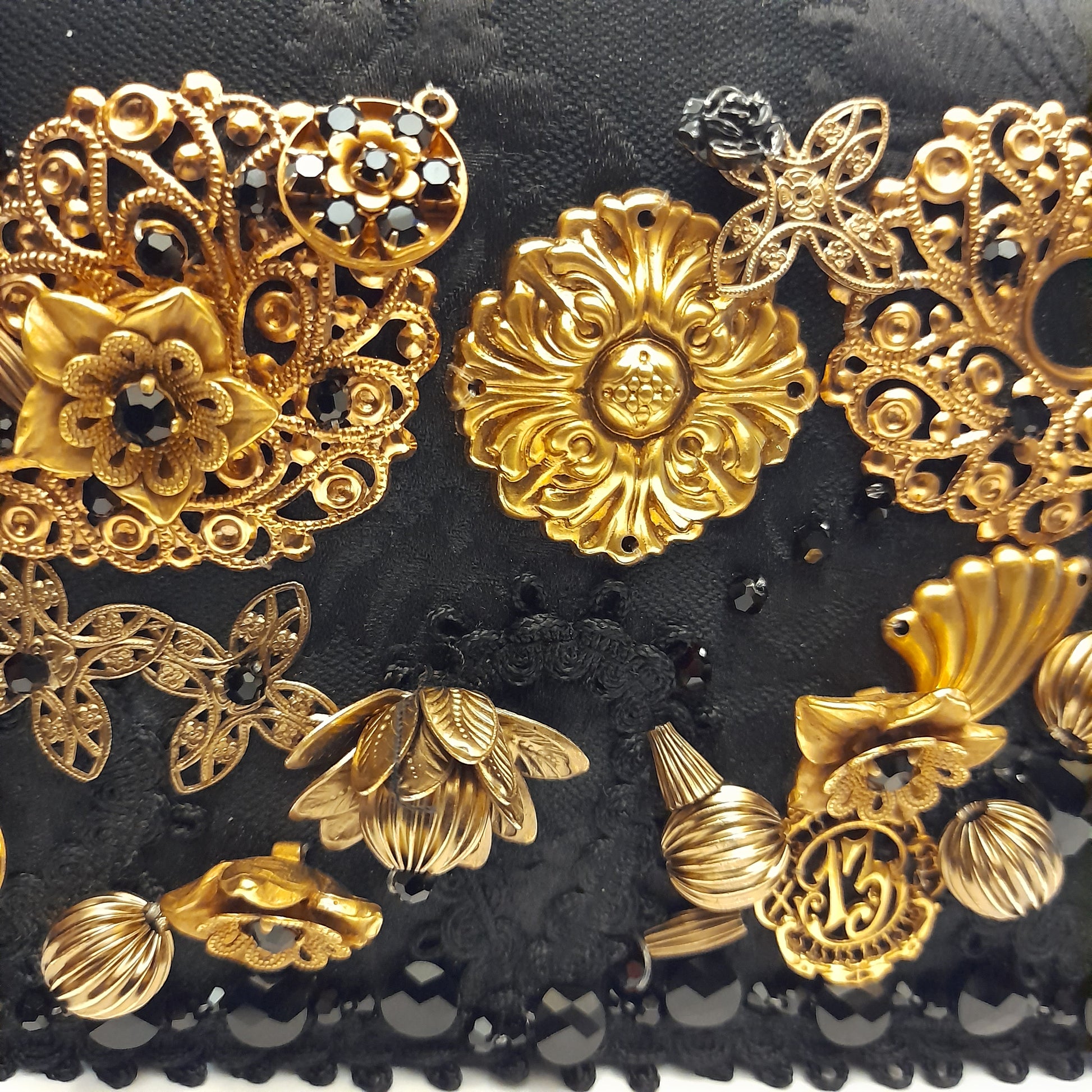 Il punto focale è l'applicazione frontale sulla patta, una ricchissima composizione di elementi decorativi in metallo dorato. Fiori, medaglioni, api e foglie con finiture miste lucide e opache si uniscono a piccole perline nere per creare un effetto gioiello tridimensionale e barocco.