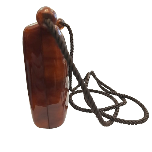La struttura compatta e solida è rifinita da una chiusura superiore discreta. La tracolla è un elegante cordino intrecciato di colore marrone scuro, fissato ai lati da due perle sferiche che richiamano la resina della borsa.