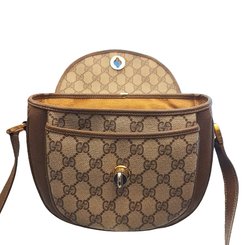 Questo raffinato accessorio, con la sua inconfondibile forma arrotondata e compatta, incarna l'eleganza intramontabile della maison italiana. La parte principale della borsa, inclusa la patta frontale, è realizzata nella celebre tela GG Supreme, caratterizzata dal motivo monogramma a doppia G nei toni del beige e del marrone scuro, un segno distintivo del marchio.