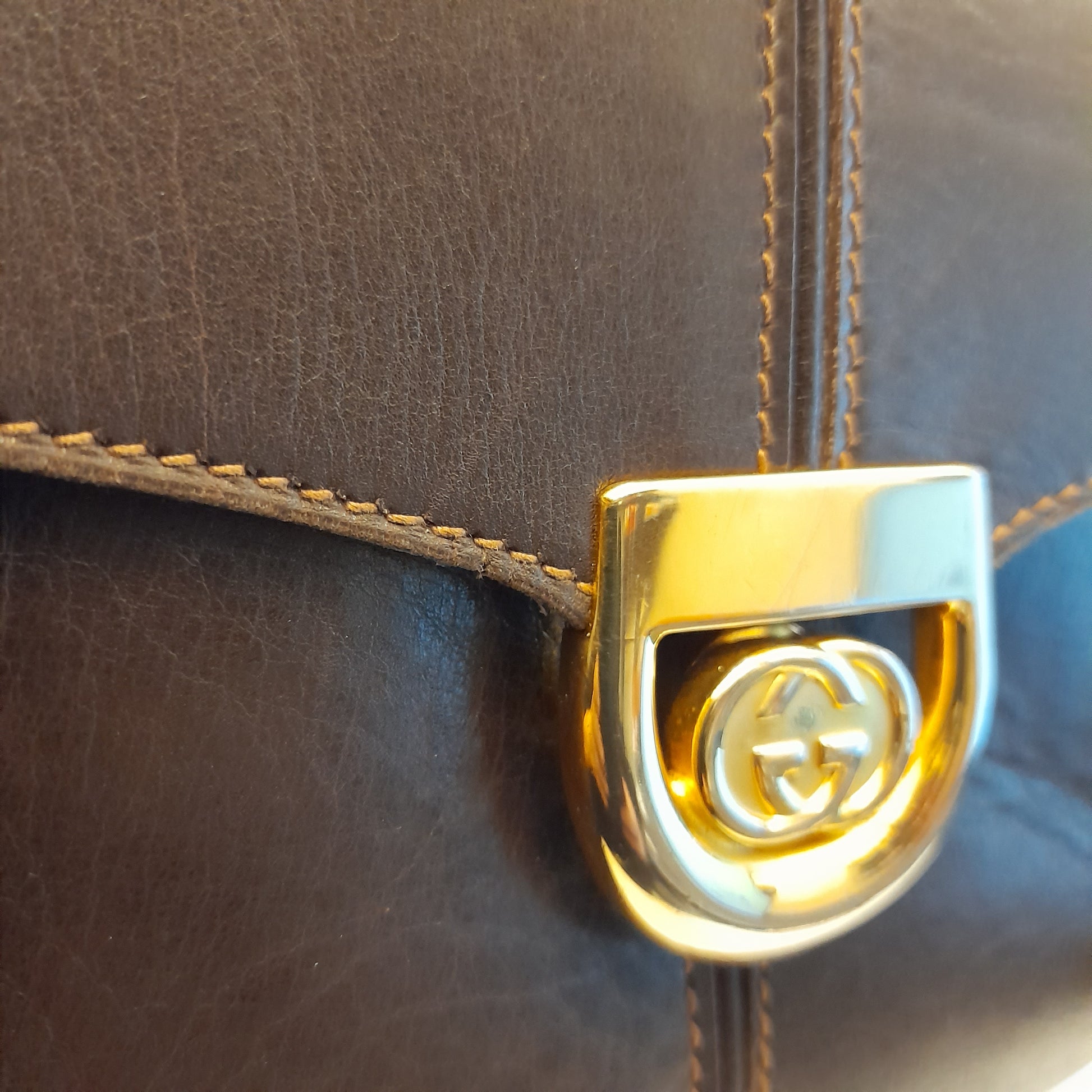 La borsa si chiude tramite una patta frontale arrotondata, dotata di una chiusura a pressione (a clip) in metallo dorato lucido. Al centro della chiusura spicca l'iconica placca con il doppio logo G intrecciato (GG), un dettaglio distintivo dei modelli degli anni '70 e '80.
