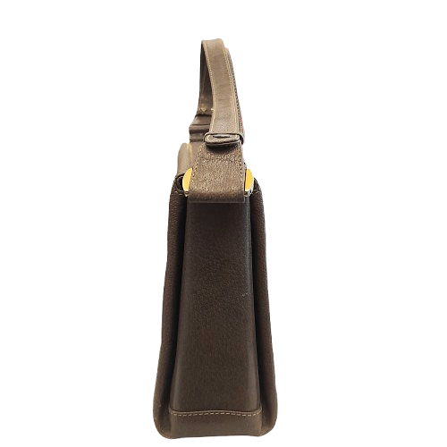 Questa elegante borsa a tracolla Gucci vintage presenta una silhouette distintiva, marcatamente rettangolare e strutturata, tipica della pelletteria di alta moda di un tempo. È realizzata in pelle di qualità in una tonalità neutra e raffinata che tende al marrone grigiastro, un colore estremamente versatile e sobrio.