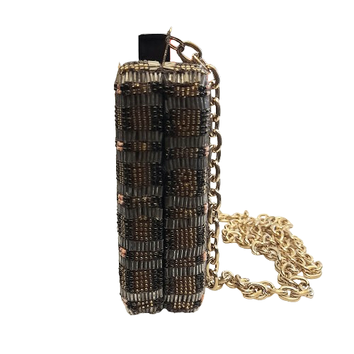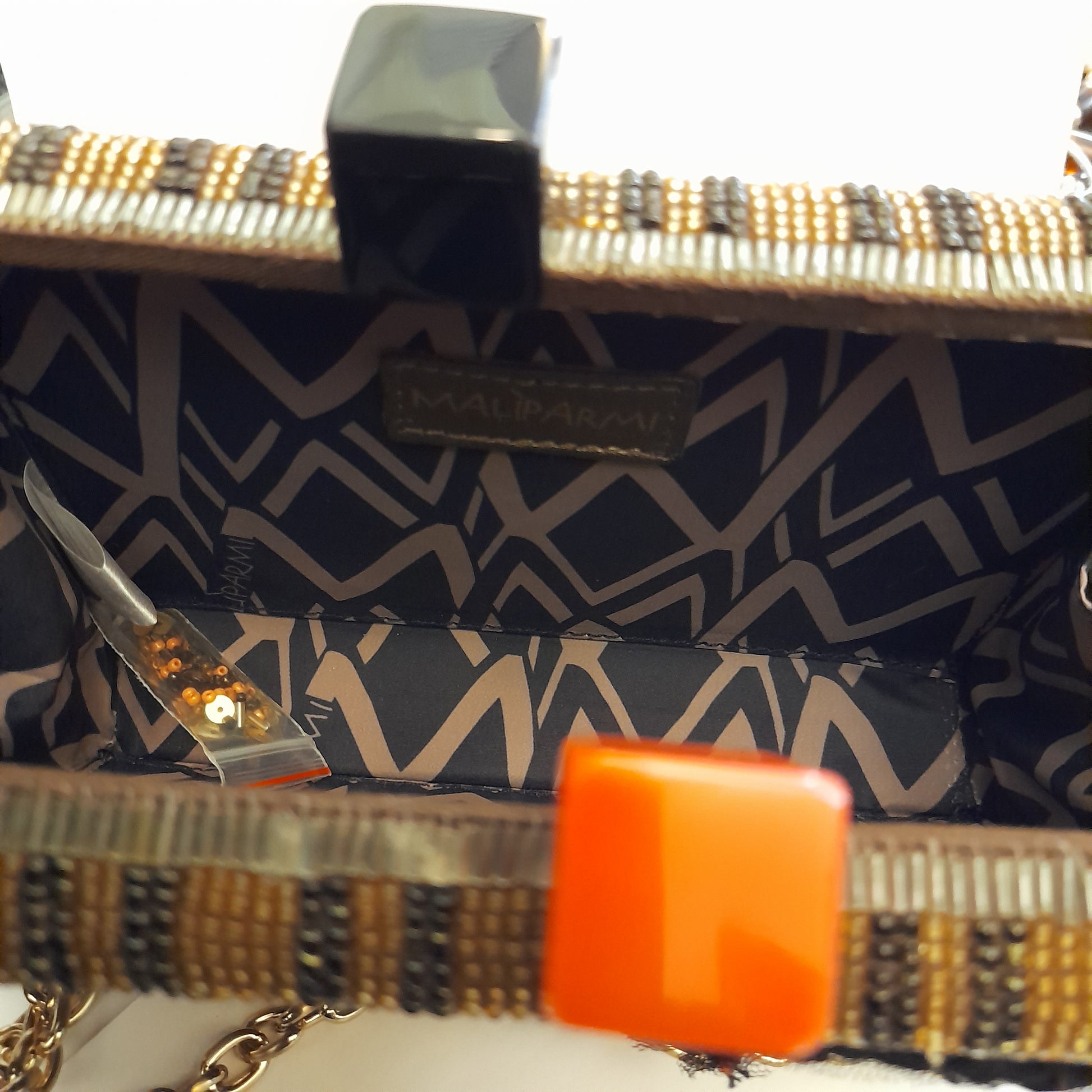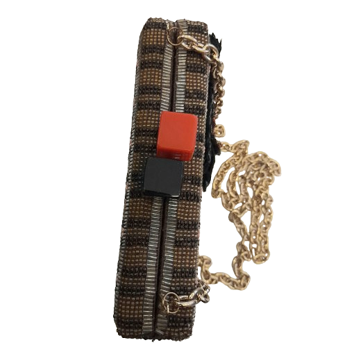 Questa splendida pochette rigida di Maliparmi è un vero gioiello di artigianalità e stile, perfetta per aggiungere un tocco di eleganza sofisticata a qualsiasi look da sera o evento speciale. La borsa presenta una texture elaborata, interamente ricoperta da una minuziosa lavorazione a perline che crea un motivo a quadri bicolore sui toni del bronzo e del nero, conferendole una lucentezza discreta ma irresistibile.