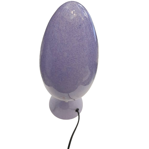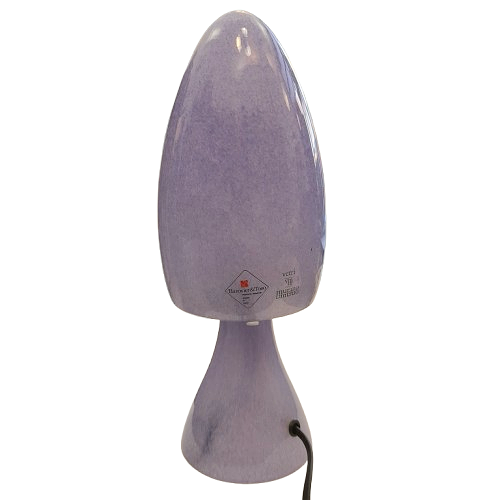 La lampada si distingue per il suo design scultoreo a forma di fungo allungato, elegante e di forte impatto visivo, tipico dello stile Mid-Century Italiano degli anni '60 e '70. Il corpo è realizzato interamente in vetro soffiato di Murano, con una finitura opalescente che presenta una suggestiva tonalità lavanda o lilla chiara. La composizione del vetro include una leggera puntinatura o velatura che, una volta accesa, diffonde la luce in modo morbido e atmosferico.