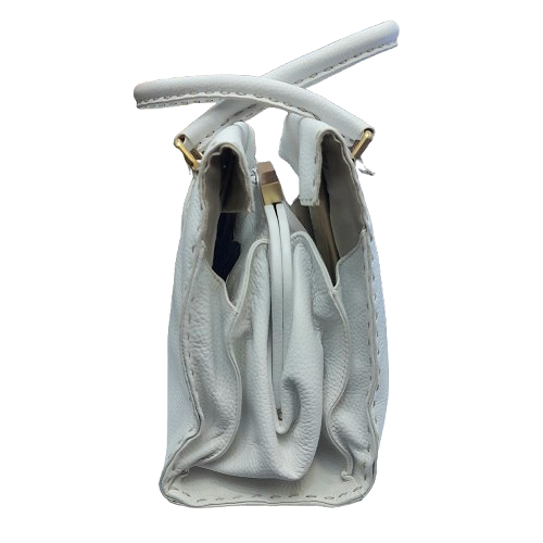 Realizzata in morbida pelle martellata di un bianco candido e luminoso, questa borsa a mano si distingue per le iconiche impunture a vista realizzate con il caratteristico filo a contrasto, un dettaglio che firma l'intera linea Selleria e ne sottolinea la costruzione sartoriale. Il design è essenziale e sofisticato, caratterizzato da una silhouette strutturata ma flessibile, completata da doppi manici arrotondati che permettono una portabilità a mano elegante e confortevole.