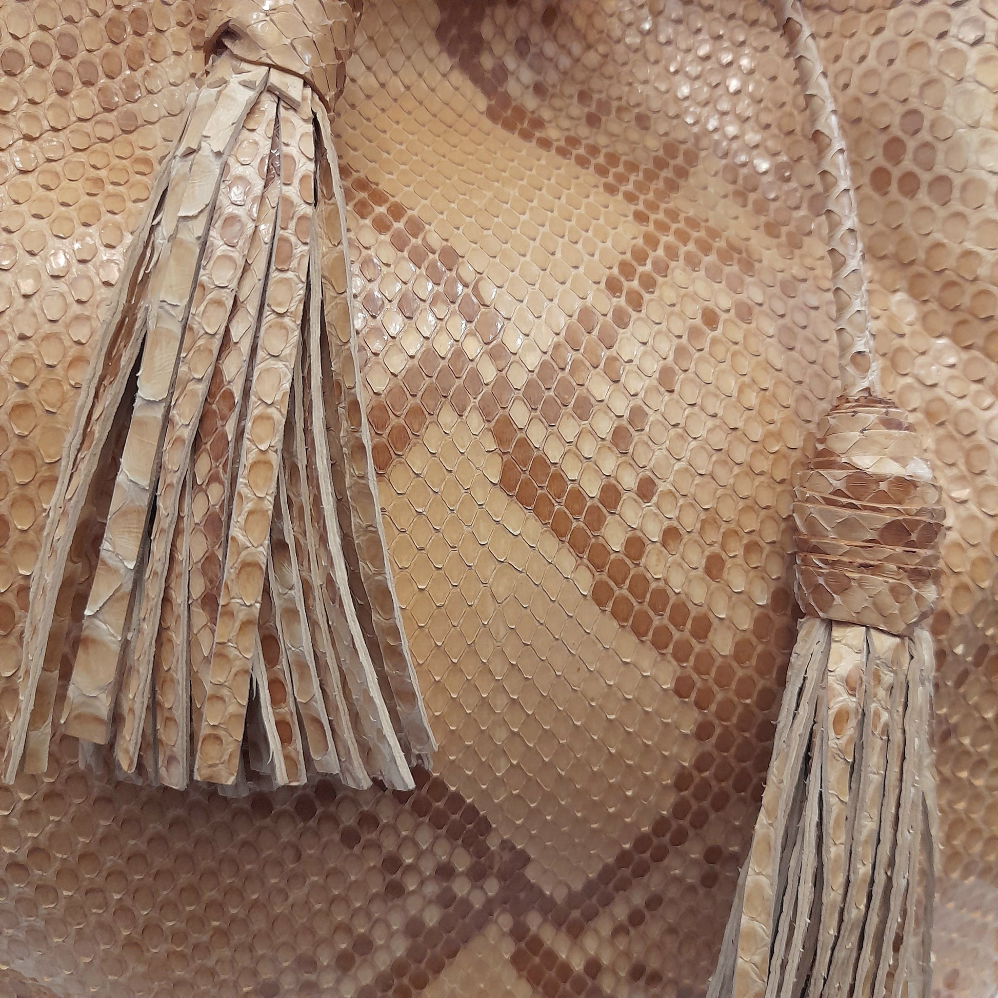 Eleva il tuo stile con il secchiello Franco Giazzi, un capolavoro di pelletteria realizzato in autentico pitone. Questo accessorio esclusivo unisce l'eleganza raffinata della pelle di serpente con un design pratico e versatile, perfetto per ogni occasione. Le morbide nappe decorative aggiungono un tocco di movimento e sofisticatezza, mentre la chiusura a coulisse assicura una protezione discreta dei tuoi effetti personali. Indossalo comodamente a spalla, per un look che non passa inosservato, esprimendo un lusso discreto e un gusto impeccabile.