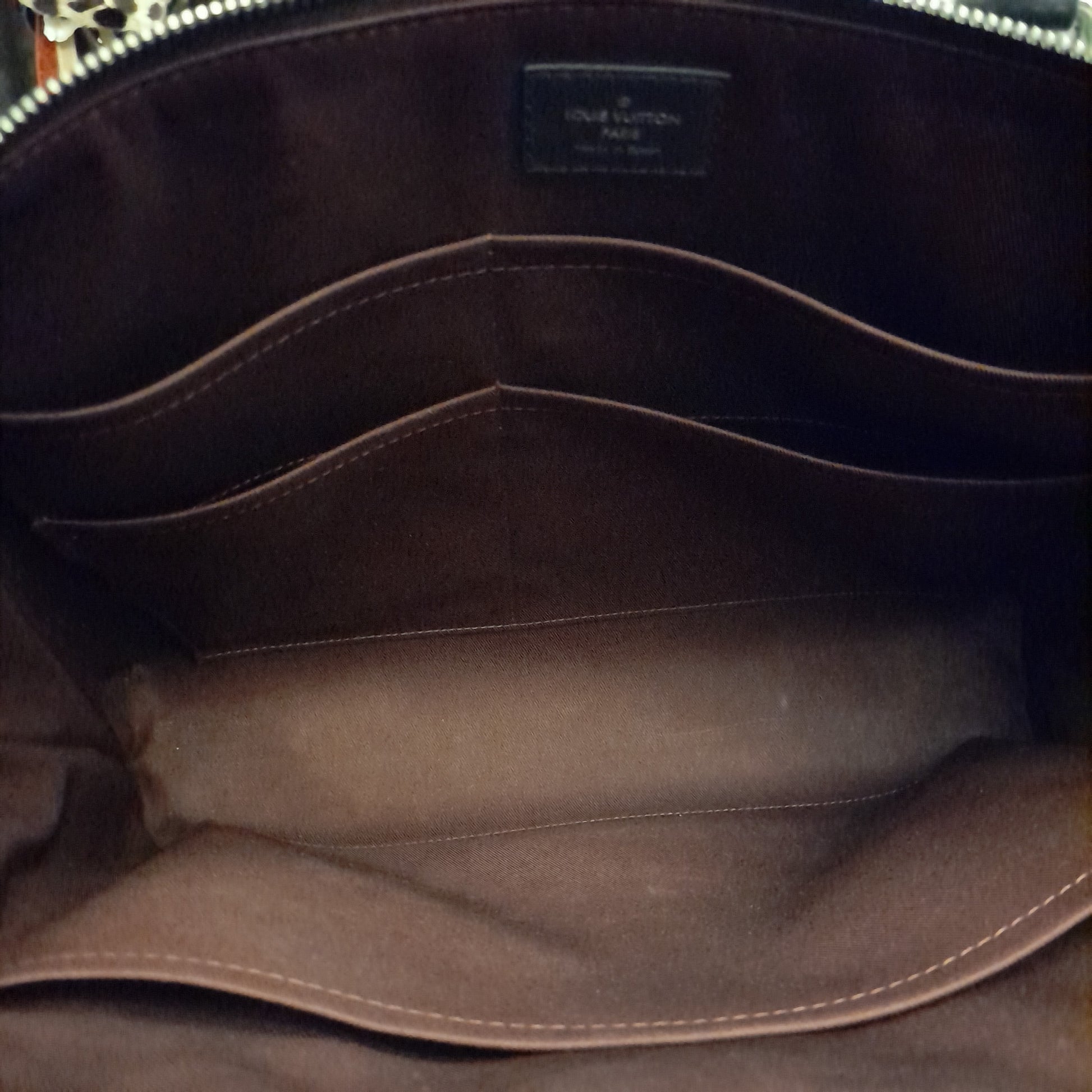 Questa raffinata borsa lavoro Louis Vuitton modello Porte-Documents Jour in tela Monogram Macassar rappresenta il perfetto equilibrio tra stile iconico e spirito metropolitano. Il design si distingue per il contrasto sofisticato tra la classica tela logata e le finiture in pelle nera, arricchite da una pratica tasca frontale con zip e dettagli metallici argentati.